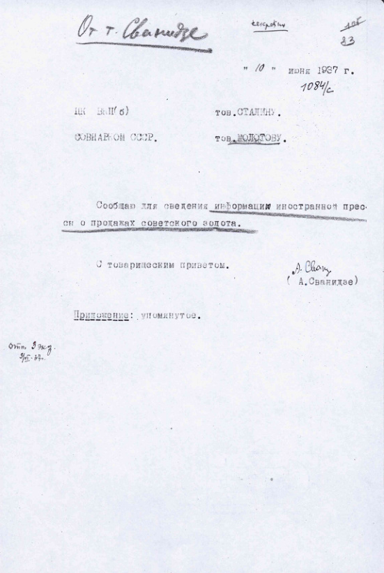 - Сообщение Заместителя Председателя Правления Государственного Банка СССР А.С. Сванидзе с обзором зарубежной прессы об экспорте золота из СССР. 10 июня 1937 г.