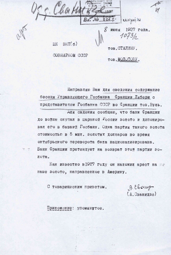 - Сообщение Заместителя Председателя Правления Государственного Банка СССР А.С. Сванидзе с содержанием беседы Управляющего Госбанком Франции Е. Лябери с представителем Госбанка СССР Е.Д. Вуль. 8 июня 1937 г.