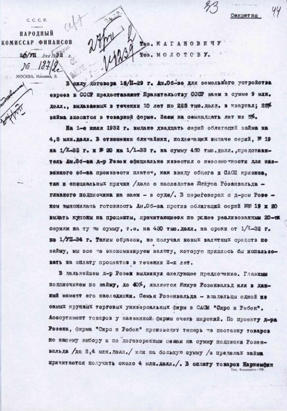 Записка Народного Комиссара Наркомата Финансов СССР Г.Ф.Гринько о займе Американского Общества для земельного устройства евреев в СССР. 25 июля 1932 г.
