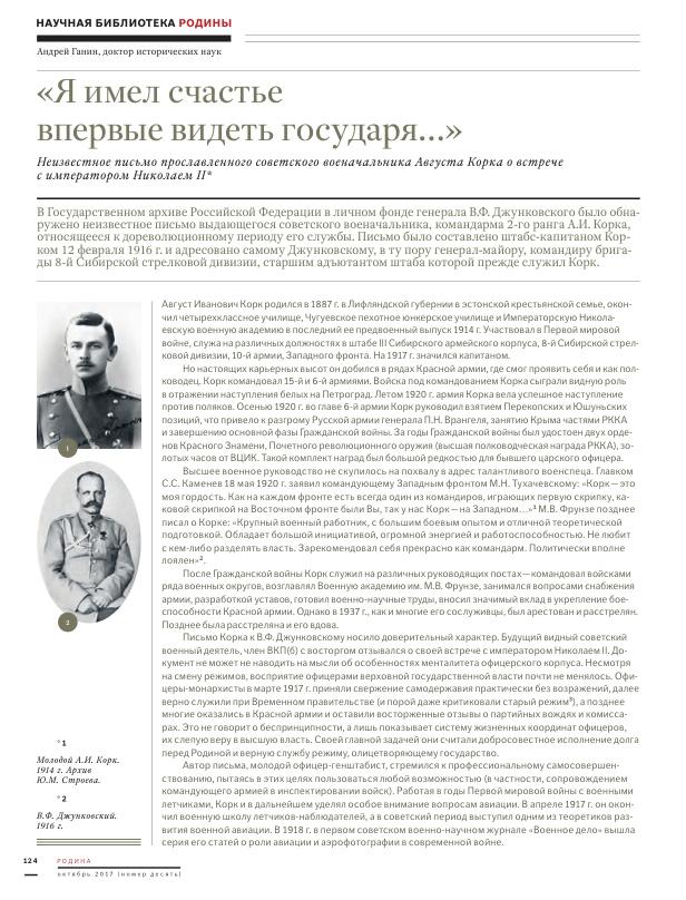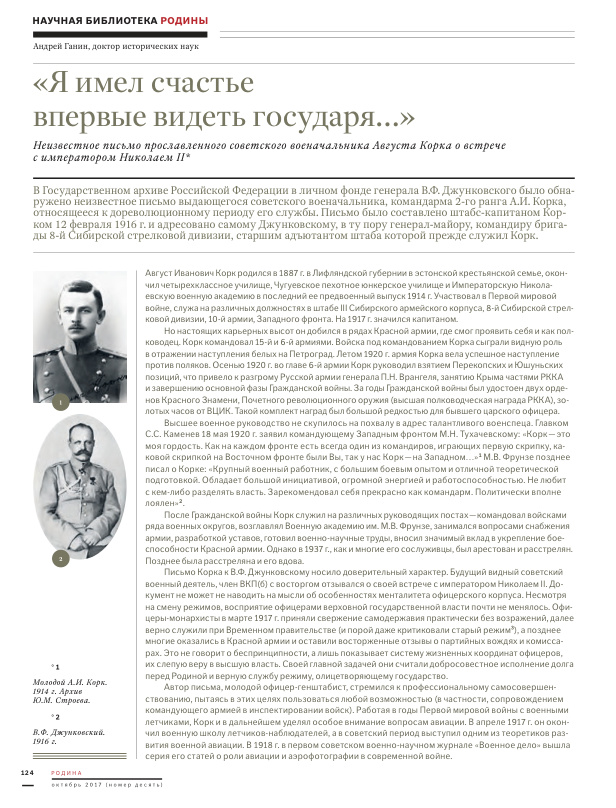 "Я имел счастье впервые видеть государя..." Неизвестное письмо прославленного советского военачальника Августа Корка о встрече с императором Николаем II