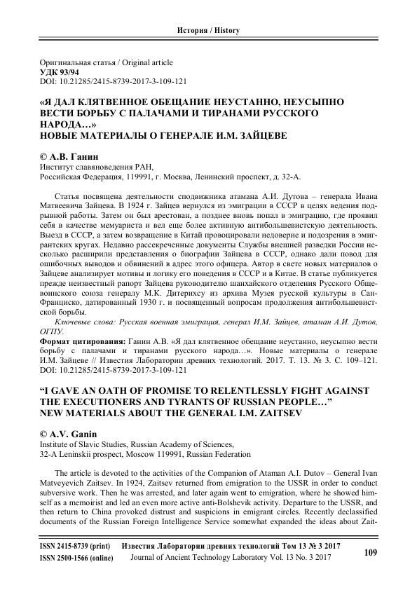"Я дал клятвенное обещание неустанно, неусыпно вести борьбу с палачами и тиранами русского народа..." Новые материалы о генерале И.М. Зайцеве