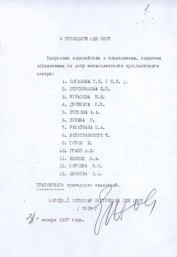 Ходатайства о помиловании, поданные осужденными по делу антисоветского троцкистского центра. 31 января 1937 г.
