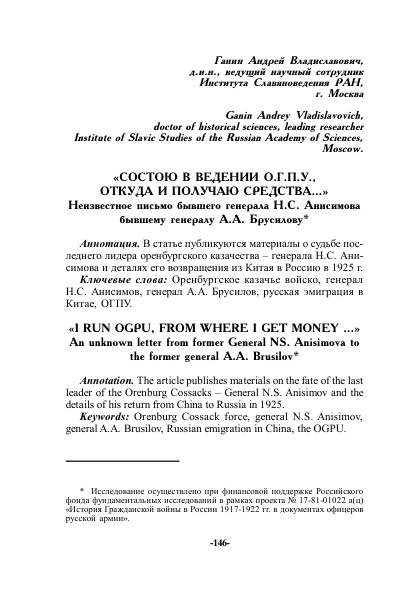 "Состою в ведении О.Г.П.У., откуда и получаю средства..." Неизвестное письмо бывшего генерала Н.С. Анисимова бывшему генералу А.А. Брусилову