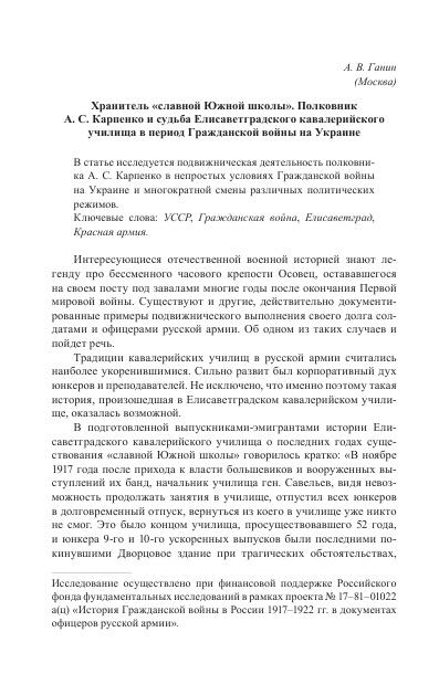 Хранитель "славной Южной школы". Полковник А.С. Карпенко и судьба Елисаветградского кавалерийского училища в период Гражданской войны на Украине