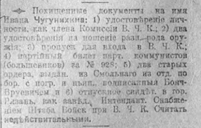 Похищенные документы сотрудника ВЧК Ивана Чугунихина. Август 1918 г.