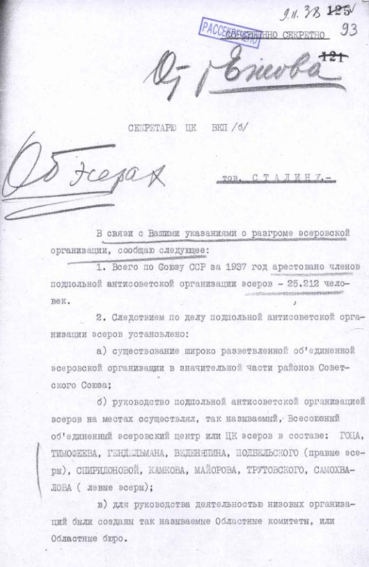 Записка Народного Комиссара НКВД Н.И. Ежова об эсерах с приложением статистической сводки. 9 февраля 1938 г.