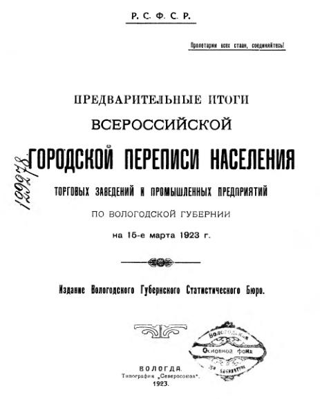 Предварительные итоги Всероссийской городской переписи по Вологодской губернии на 15.03.1923