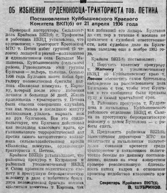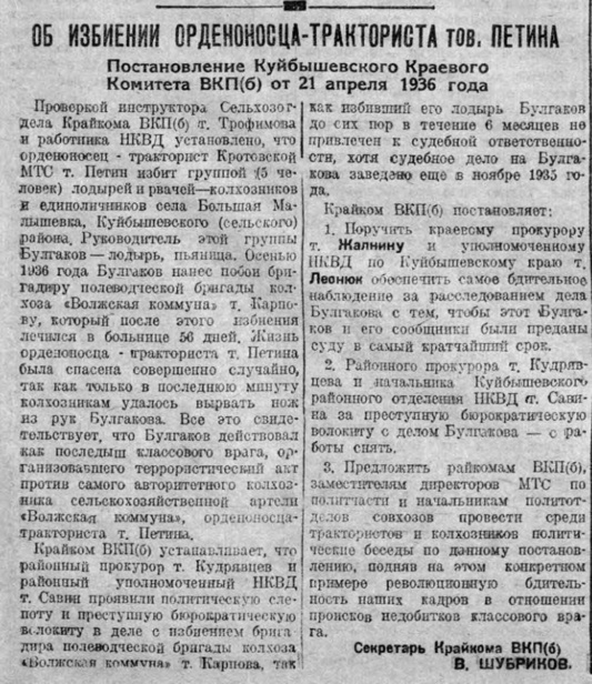 Избиение орденоносца-тракториста Петина. Куйбышевский край. Апр. 36 г