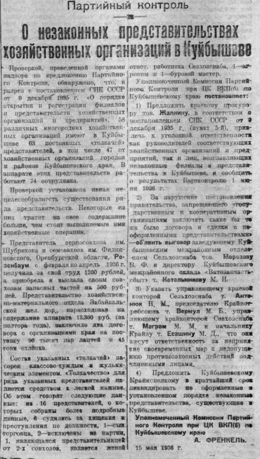 О незаконных представительствах хозяйственных организаций в Куйбышеве. Партийный контроль. Май 36 г.