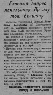 Гласный запрос начальнику Крайзу о премиях бригаде женщин-трактористок. Авг. 36 г.