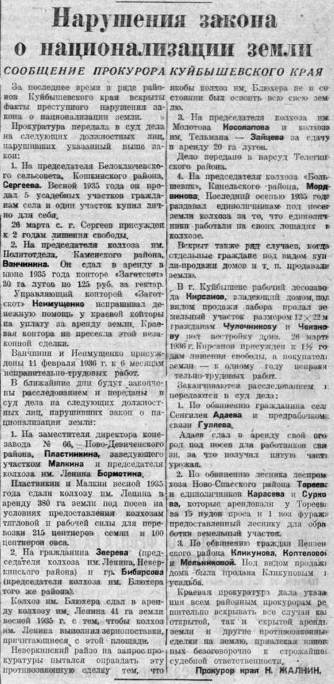 Нарушения закона о национализации земли. Куйбышевский край. Апр. 36 г
