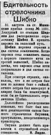 Бдительность стрелочника Шибко. Вредительство на железной дороге. Сентябрь 35 г.