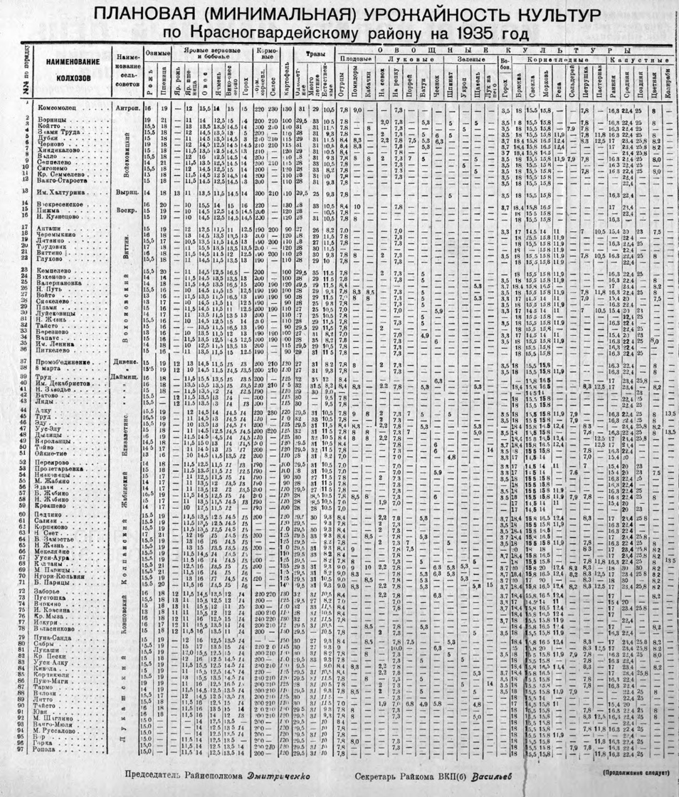 Колхозы Красногвардейского района Ленинградской области и их плановая урожайность. Апрель 35 г.