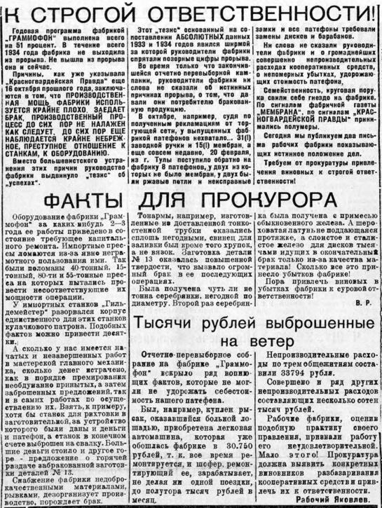 К строгой ответственности! (Непорядки на фабрике Граммофон). Февраль 35 г.