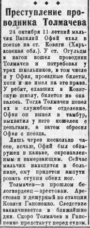 Преступление проводника Толмачева (скинул ребенка с поезда). Декабрь 35 г.