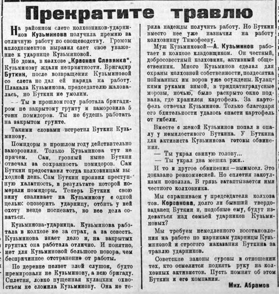 Травля колхозников-ударников Кузьминовых. Апрель 35 г.