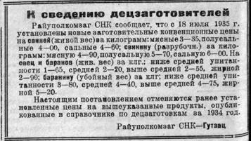 К сведению децзаготовителей. Заготовительные цены на мясо. Июль 35 г.