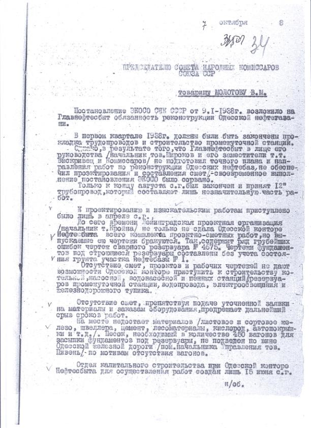 Записка А.Я. Вышинского о возможности срыва работ по реконструкции Одесской нефтегавани и нефтебаз. 7 октября 1938 г.