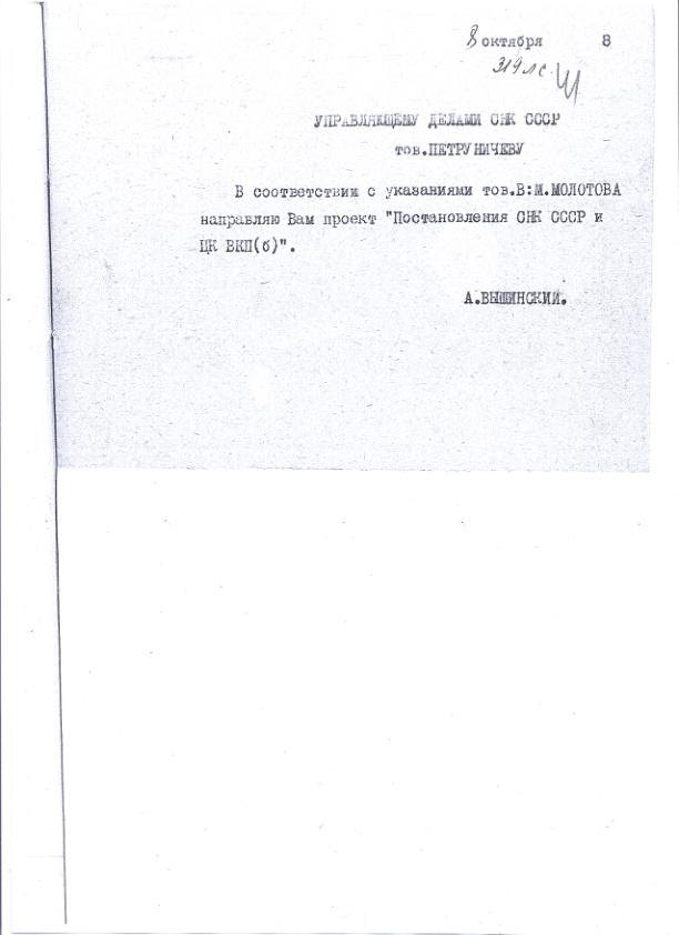 Проект Постановления СНК СССР и ЦК ВКП(б) об антигосударственной практике некоторых колхозов. 8 октября 1938 г.