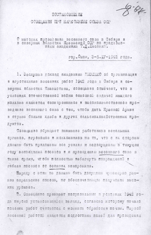 Постановление совещания при НКЗ о методах весеннего сева в Сибири и Казахской ССР по предложениям академика Т.Д. Лысенко. 5 апреля 1942 г.