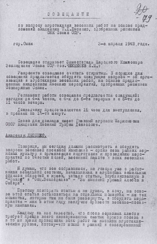 Совещание при НКЗ по вопросу агротехники весенних работ по предложениям академика Т.Д. Лысенко. 3 апреля 1942 г.