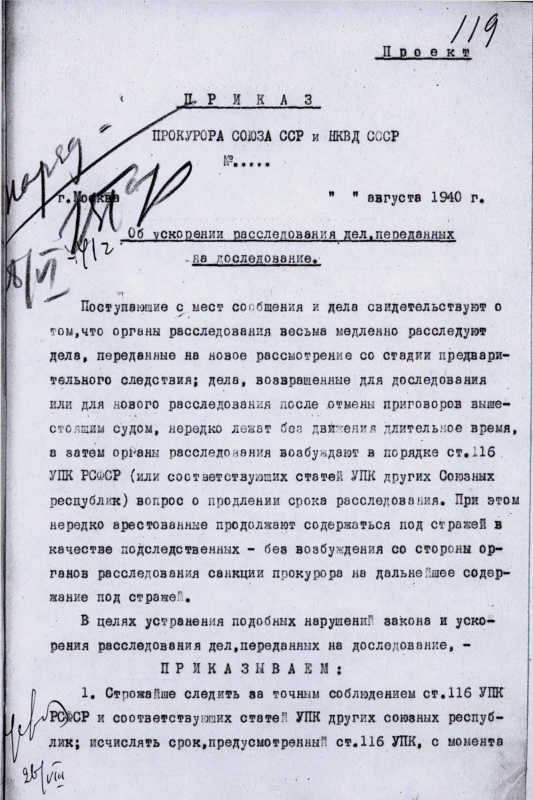 Проект Приказа Прокуратуры Союза ССР и НКВД СССР Об ускорении расследования дел, переданных на доследование. 25 сентября 1940 г.