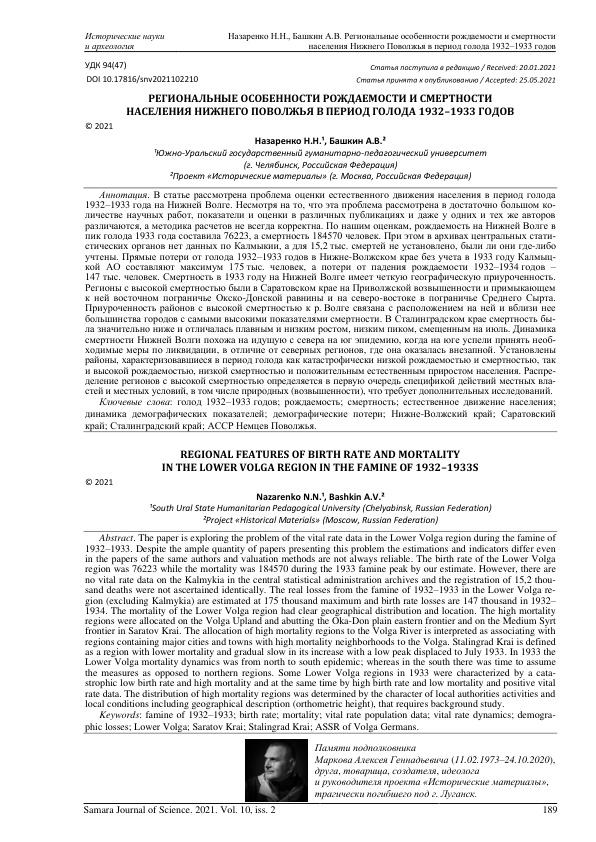 Региональные особенности рождаемости и смертности населения Нижнего Поволжья в период голода 1932–1933 годов