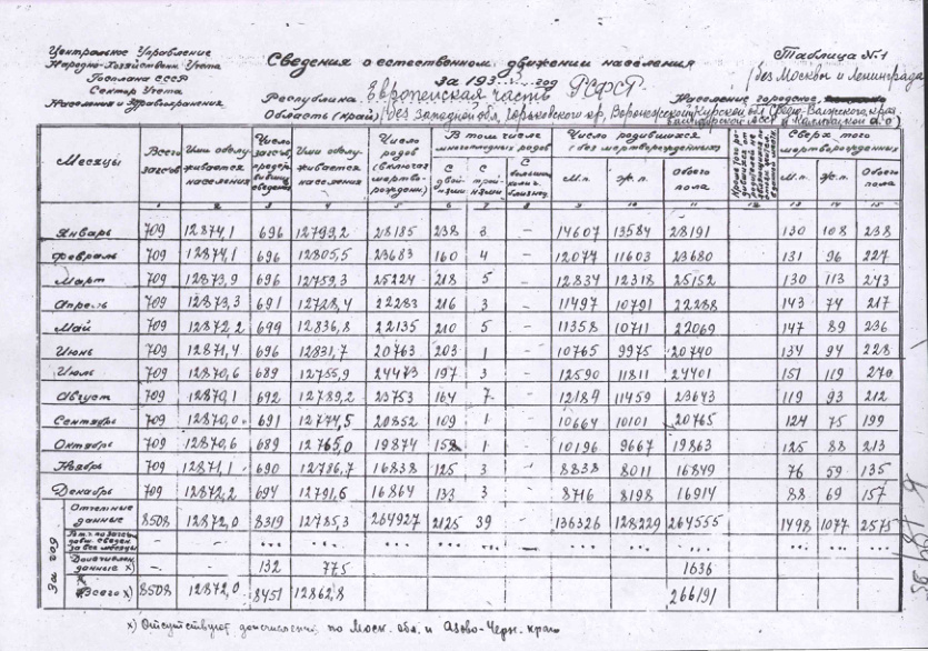 Разработочные таблицы ЦУНХУ СССР данных о естественном движении населения в Украинской ССР за 1933 г.