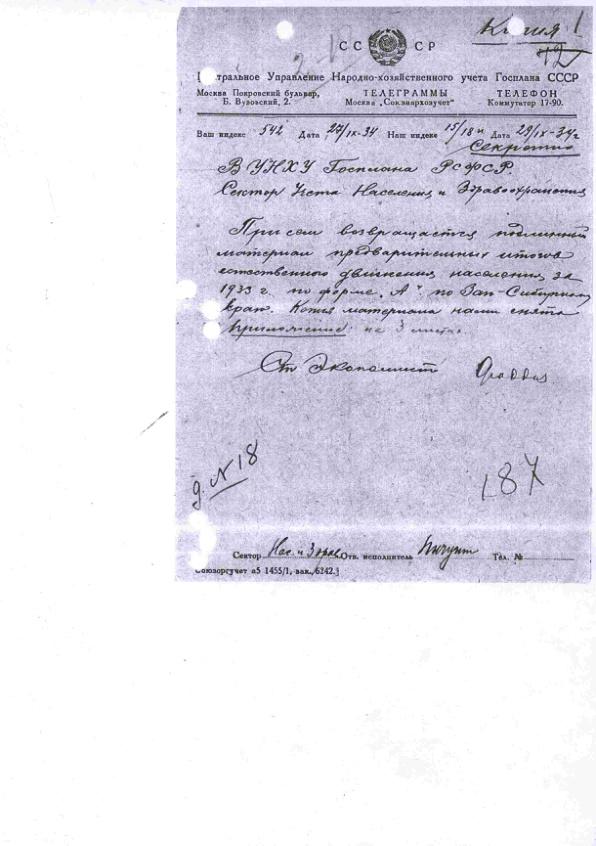 - Разработочные таблицы ЦНХУ предварительных итогов естественного движения населения по РСФСР, Украинской, Белорусской, Закавказской и Туркменской ССР в районном разрезе за 1933 г.