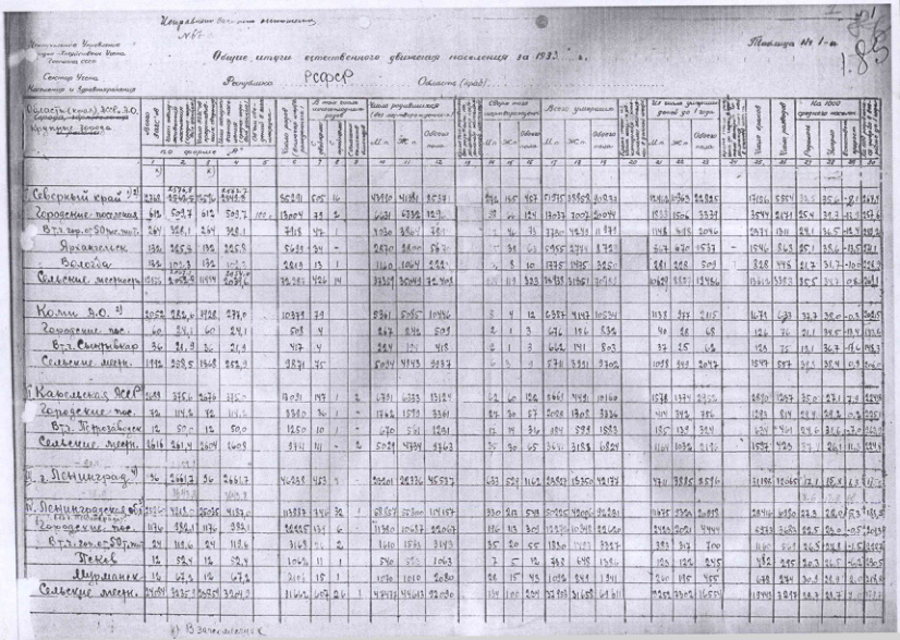 - Разработочные таблицы ЦУНХУ СССР общих итогов естественного движения населения по РСФСР и союзным республикам в областном разрезе за 1933 г.