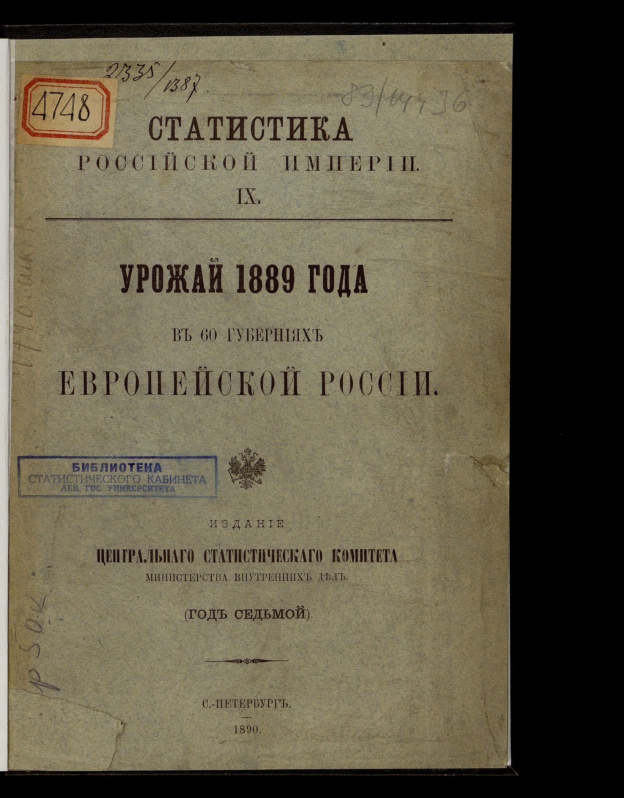Издание Центрального Статистического Комитета Министерства внутренних дел. Санкт-Петербург. 1890
