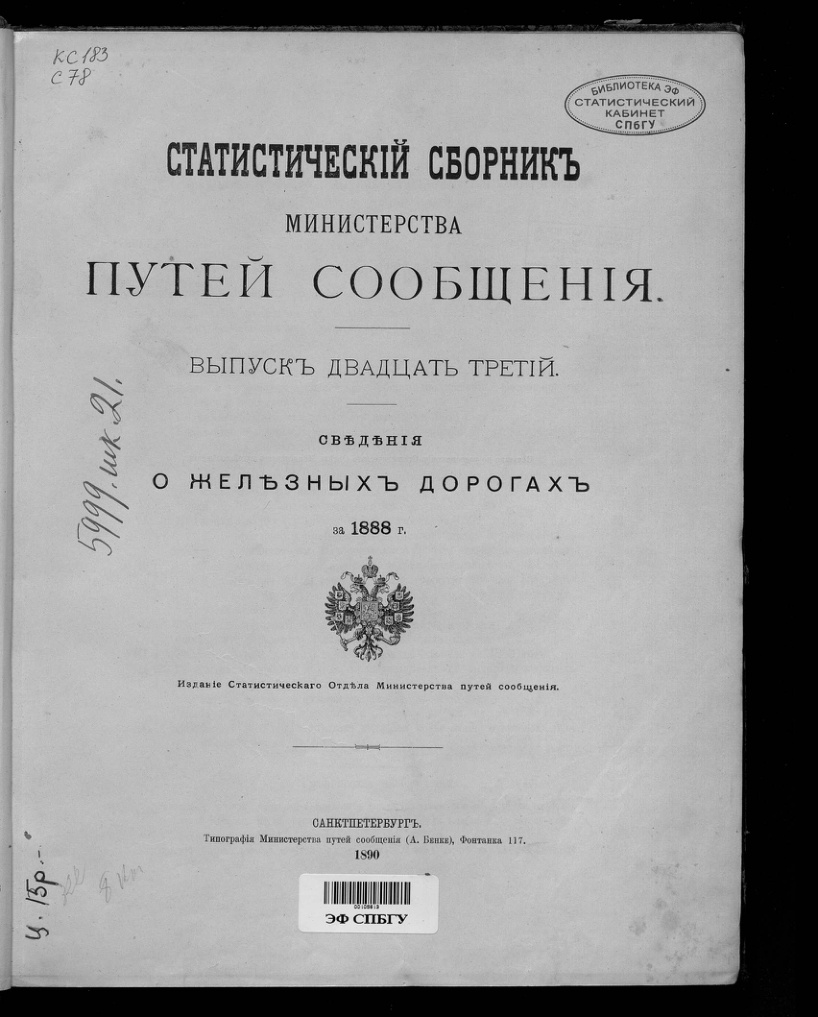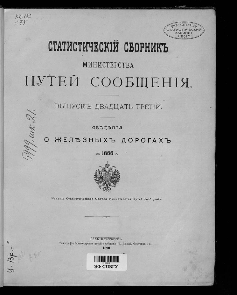 Статистический сборник Министерства путей сообщения. Вып. 23. Сведения о железных дорогах за 1888 г.