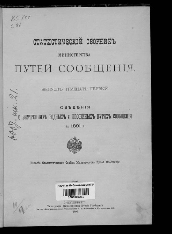 Статистический сборник Министерства путей сообщения. Выпуск 31. Сведения о внутренних водных и шоссейных путях сообщения за 1891 г