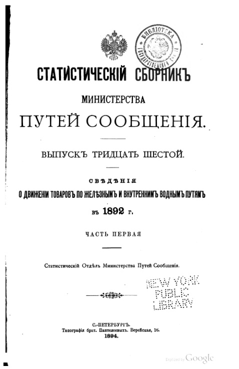 Издание Статистического Отдела Министерства Путей Сообщения. С.-Петербург, 1894