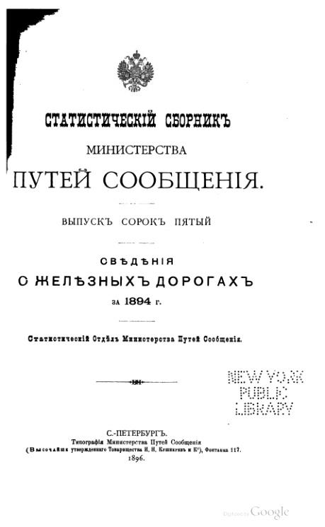 Статистический сборник Министерства путей сообщения. Выпуск 45. Сведения о железных дорогах за 1894 г.