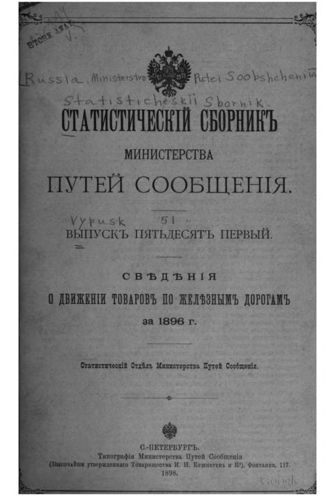 Статистический сборник Министерства путей сообщения. Выпуск 51. О движении товаров по железным дорогам за 1896 г.