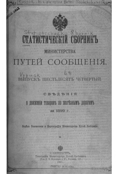 Статистический сборник Министерства путей сообщения. Выпуск 64. О движении товаров по железным дорогам за 1899 г.