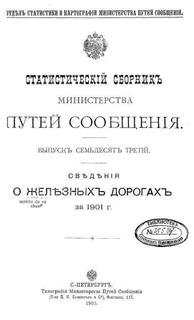 Отдел Статистики и Картографии Министерства Путей Сообщения. С.-Петербург, 1903
