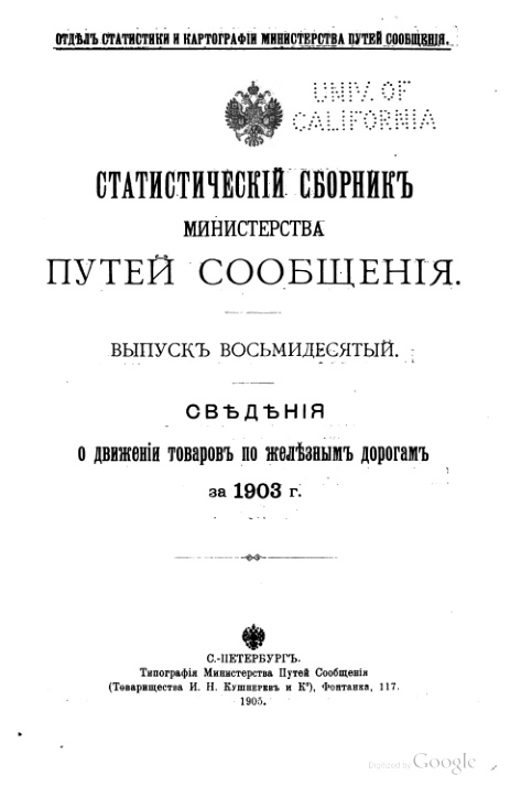 Отдел Статистики и Картографии Министерства Путей Сообщения. С.-Петербург, 1905