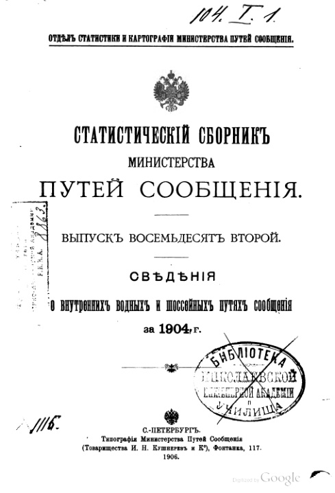 Статистический сборник Министерства путей сообщения. Выпуск 82. Сведения о внутренних водных и шоссейных путях сообщения за 1904