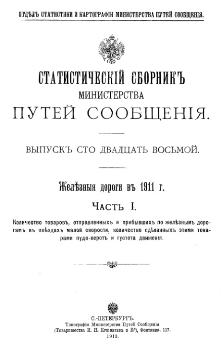 Отдел Статистики и Картографии Министерства Путей Сообщения. С.-Петербург, 1913