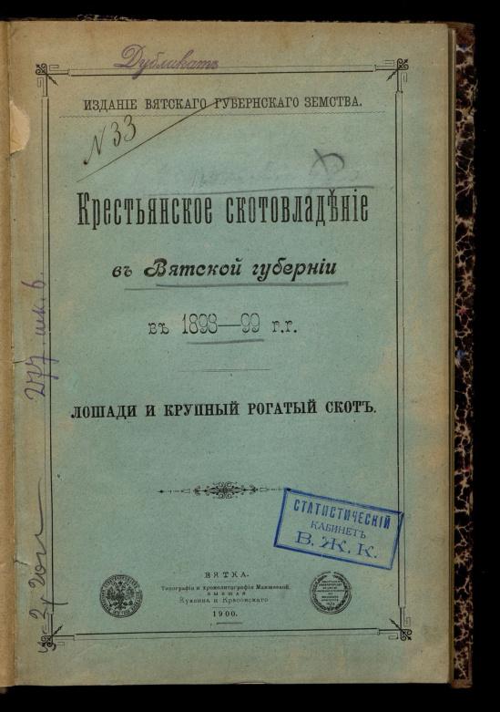 Крестьянское скотовладение в Вятской губернии в 1898-99. Лошади и крупный рогатый скот