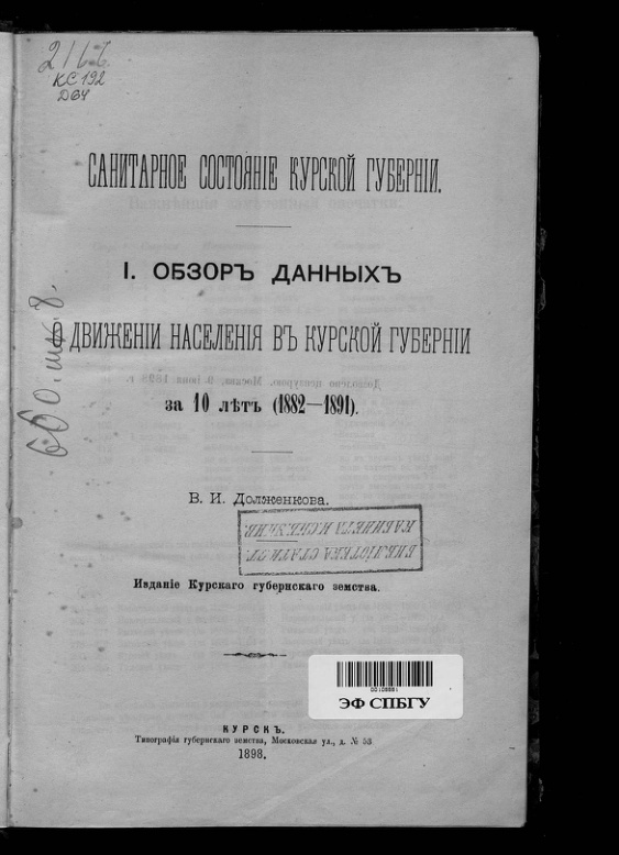 Санитарное состояние Курской губернии. 1. Обзор данных о движении населения в Курской губернии за 10 лет (1882-1891)