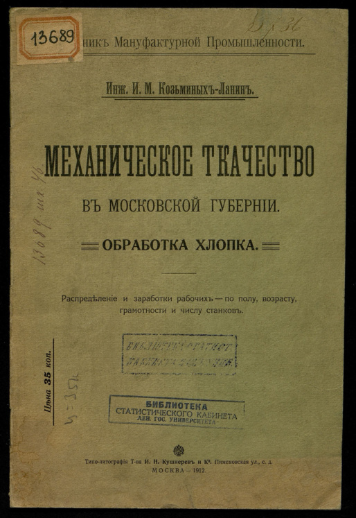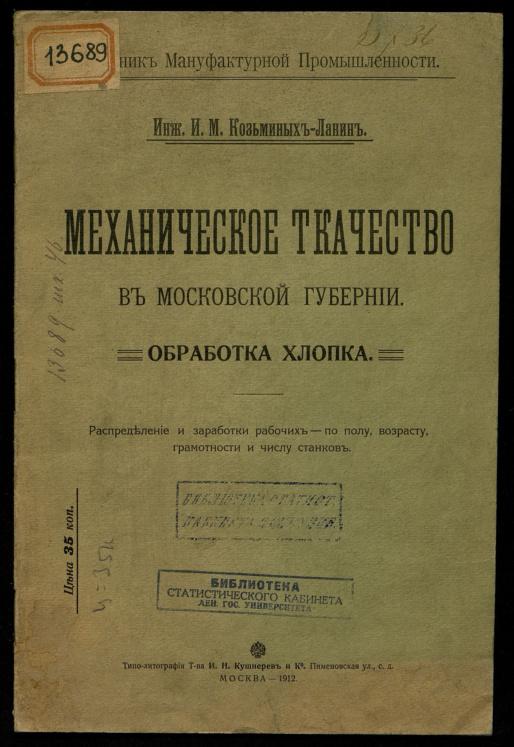 Механическое ткачество в Московской губернии. Обработка хлопка. Распределение и заработки рабочих 1912