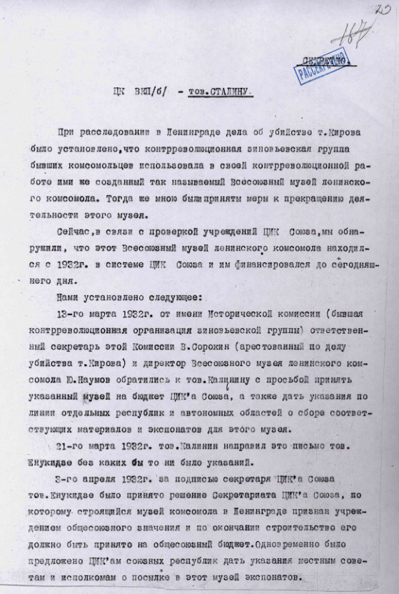 Записка Н.И. Ежова на имя И.В. Сталина о финансировании ЦИКом СССР Всесоюзного музея ленинского комсомола. Апрель 1935 г.