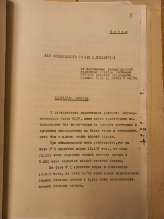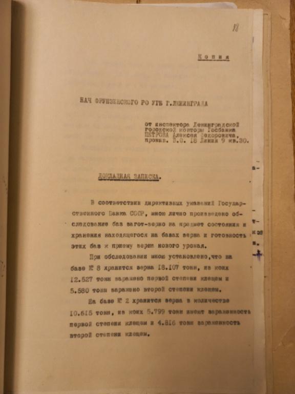 Докладная записка инспектора Ленгорконторы Госбанка А.Ф. Петрова о произведенном обследовании баз заготзерно. 11 августа 1938 г.