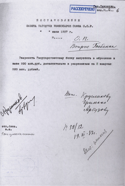 Постановление Политбюро ЦК ВКП(б) п. 50/12 "Вопрос Госбанка" с приложением записки Г.Ф. Гринько. 19 июня 1937 г.