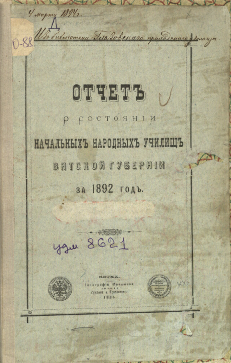 Отчет о состоянии начальных народных училищ Вятской губернии за 1892 год