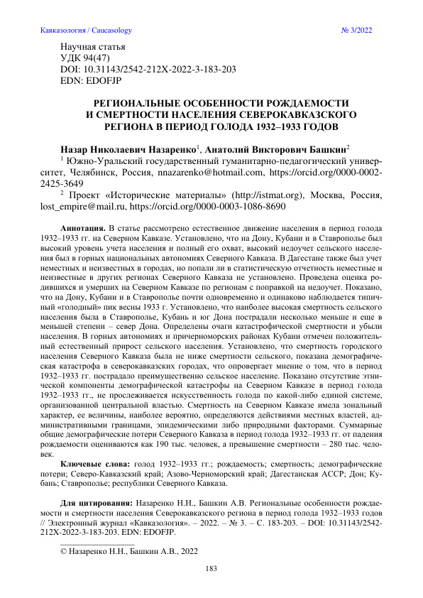 Электронный журнал «Кавказология». – 2022. – № 3. – С. 183-203