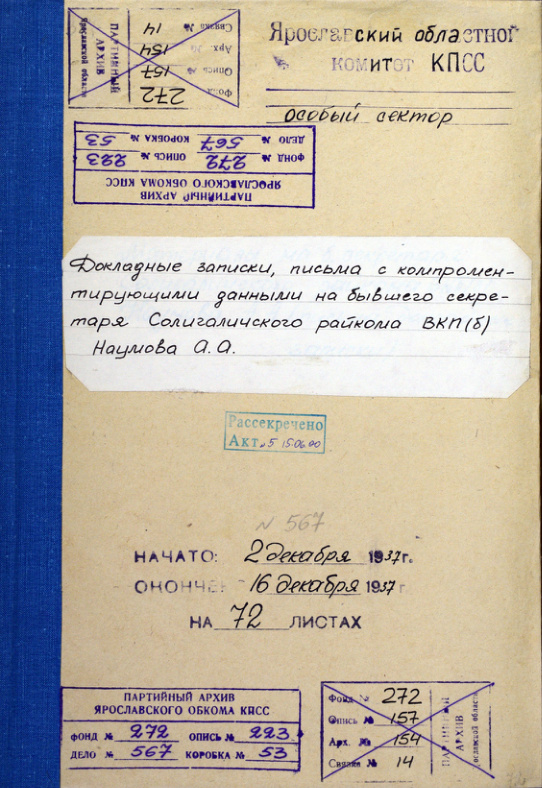 Докладные записки, письма с компрометирующими данными на бывшего секретаря Солигаличского райкома ВКП(б) Наумова А.А. 16 декабря 1937 г.